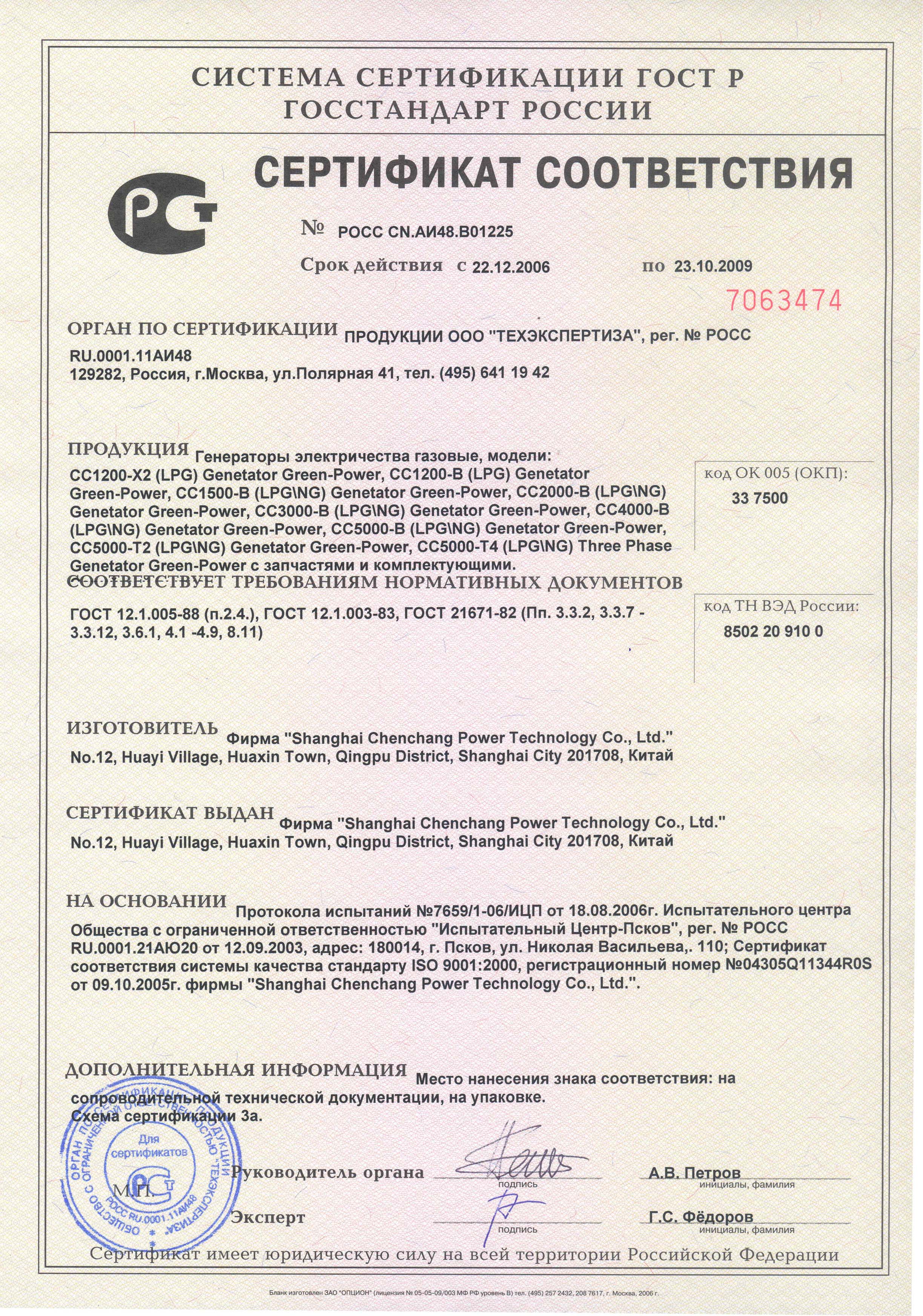 Сертификат РФ на газовые генераторы Green Power